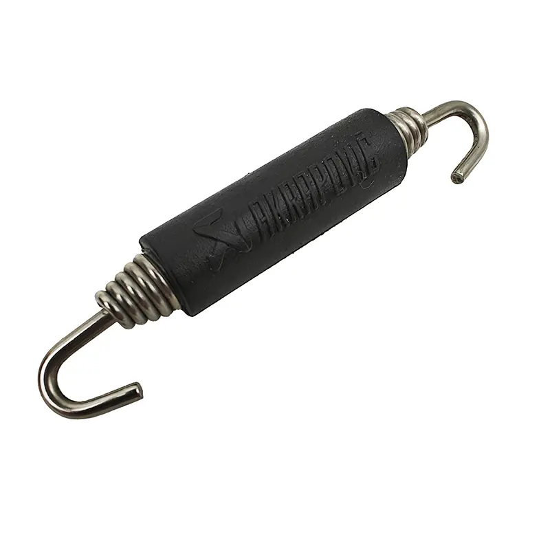 Gemaakt van roestvast staal en bekleed met zwart rubber voorzien van het vette Akrapovič logo.