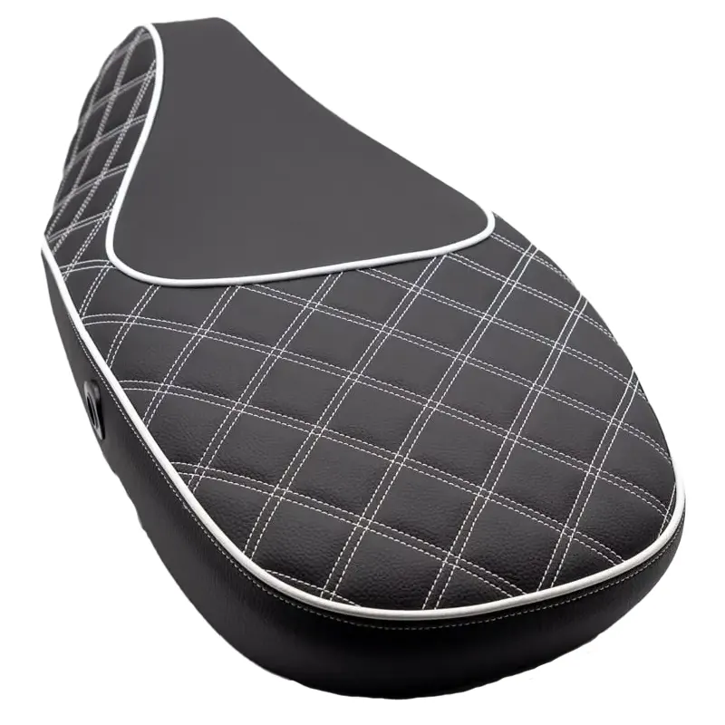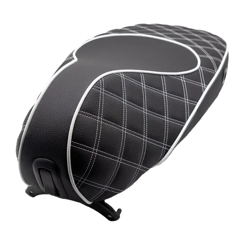 Maak je scooter echt uniek met één van onze custom Roger Styling zadels. Wij nemen daarvoor een origineel Piaggio/Vespa zadel als basis, en laten die met luxe en oersterk kunstleer bekleden. De vakman die we daarvoor inschakelen heeft op dit zwarte zadel met wit draad een sjiek ruit patroon gestikt.